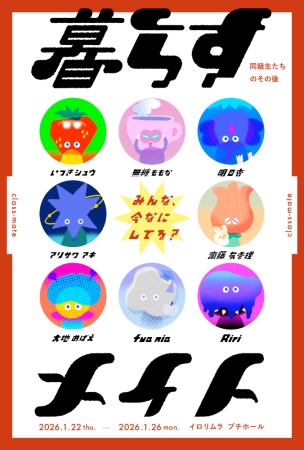 暮らすメイト・明日杏(あした あんず)・アリサワ アキ・いつきシュウ・齋藤 友香理 (さいとう ゆかり)・大地 めばえ(だいちめばえ)・fua nia (ふぁ にぁ)・無糖ももな(むとうももな)・Riri (リリ)(五十音順)2026/ 1/22(木)~ 1/26(月)12:00~20:00(最終日は、18:00まで)展示会場:プチホール「忙しい日々の中でも、”つくりたい"気持ちを大切に」をコンセプトにした高校の同級生たちの展示会です。