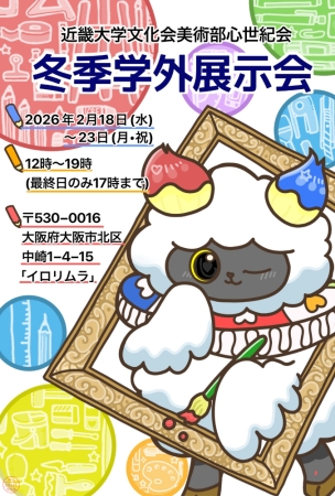 近畿大学文化会 美術部心世紀会『冬季学外展示会』2026/ 2/18(水)~ 2/23(月)12:00~19:00(最終日は、17:00まで)展示会場:[89]画廊 展示室2・3