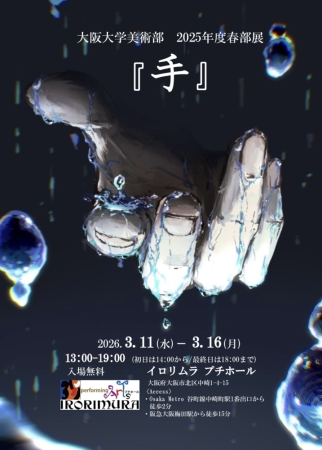 大阪大学美術部 2025年度春部展『手』2026/ 3/11(水)~ 3/16(月)13:00~19:00(初日は14:00から、最終日は18:00まで)展示会場:プチホール大阪大学美術部 X(Twitter): @handai_art Instagram: osaka._.uart