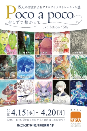 EXHIBITION 13poco a poco ~少しずつ繋がって~上野由良・村山ゆかり・ガホォ・みずほ・鹿ろくこた・おしお・網元マヤ・駒井春樹・森絵キラリ山幸・うめひな・鈴木英太郎。・まうすが・藤白針子2026/ 4/15(水)~ 4/20(月)12:00~19:00(初日は13:00から、最終日は18:00まで)展示会場:[89]画廊 展示室1