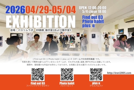 2026 EXHIBITION合同写真展Find out 03 (ファインド・アウト・ゼロサン)Photo habit (フォト ハビット)plus α (プラス アルファ)2026/ 4/29(水)~ 5/ 4(月)12:00~20:00(最終日は、18:00まで)展示会場:[89]画廊 展示室2・3